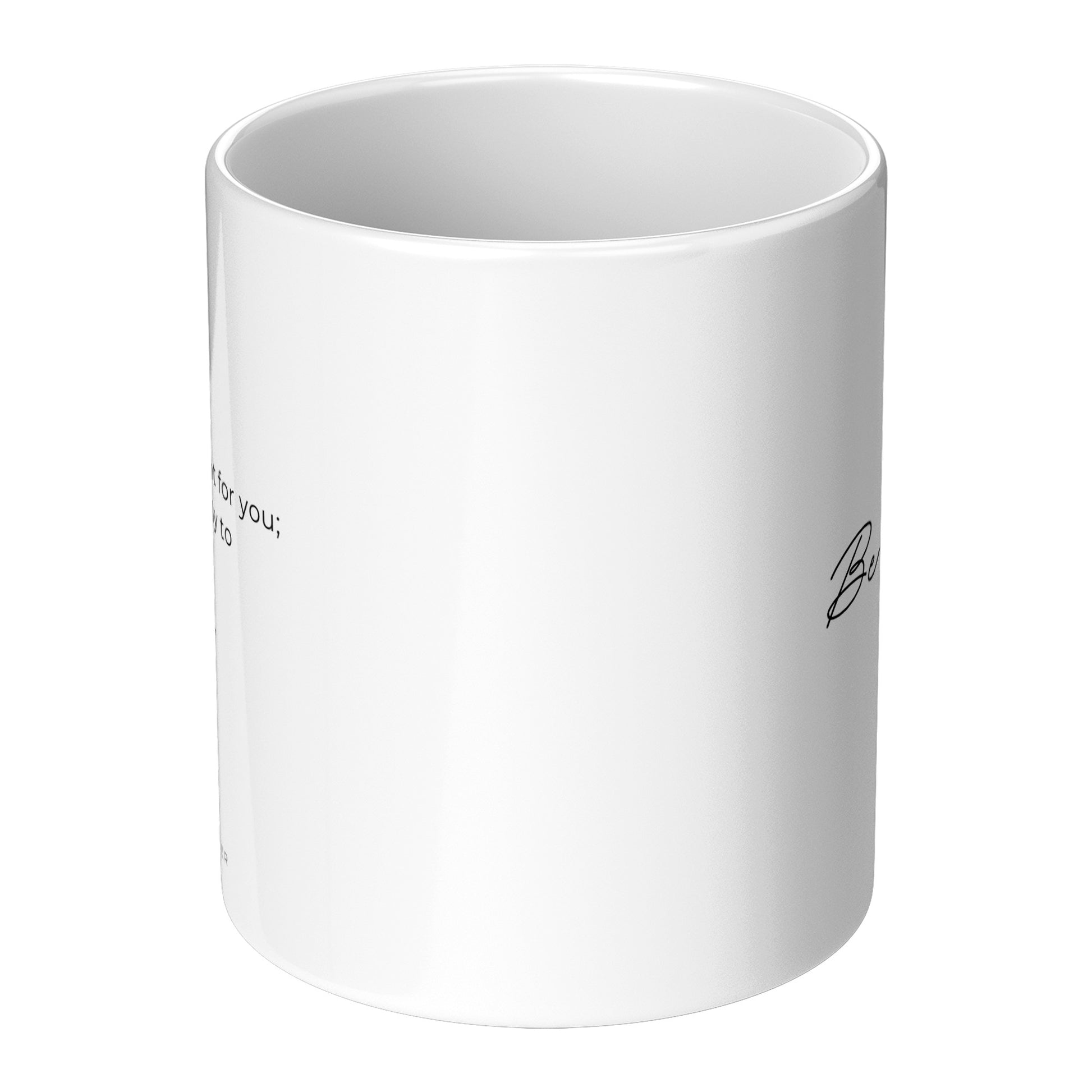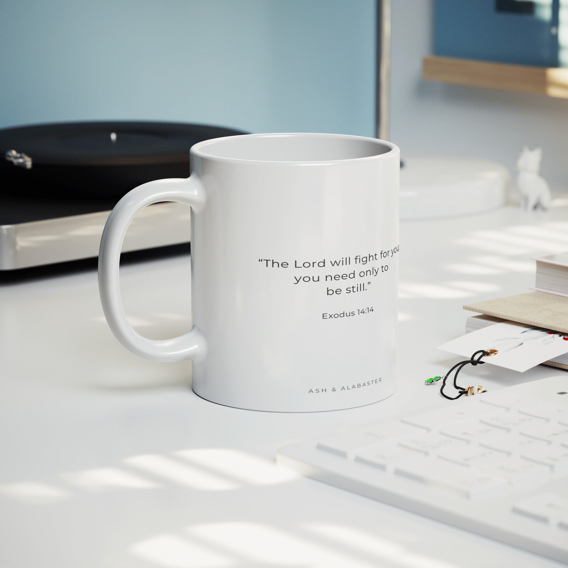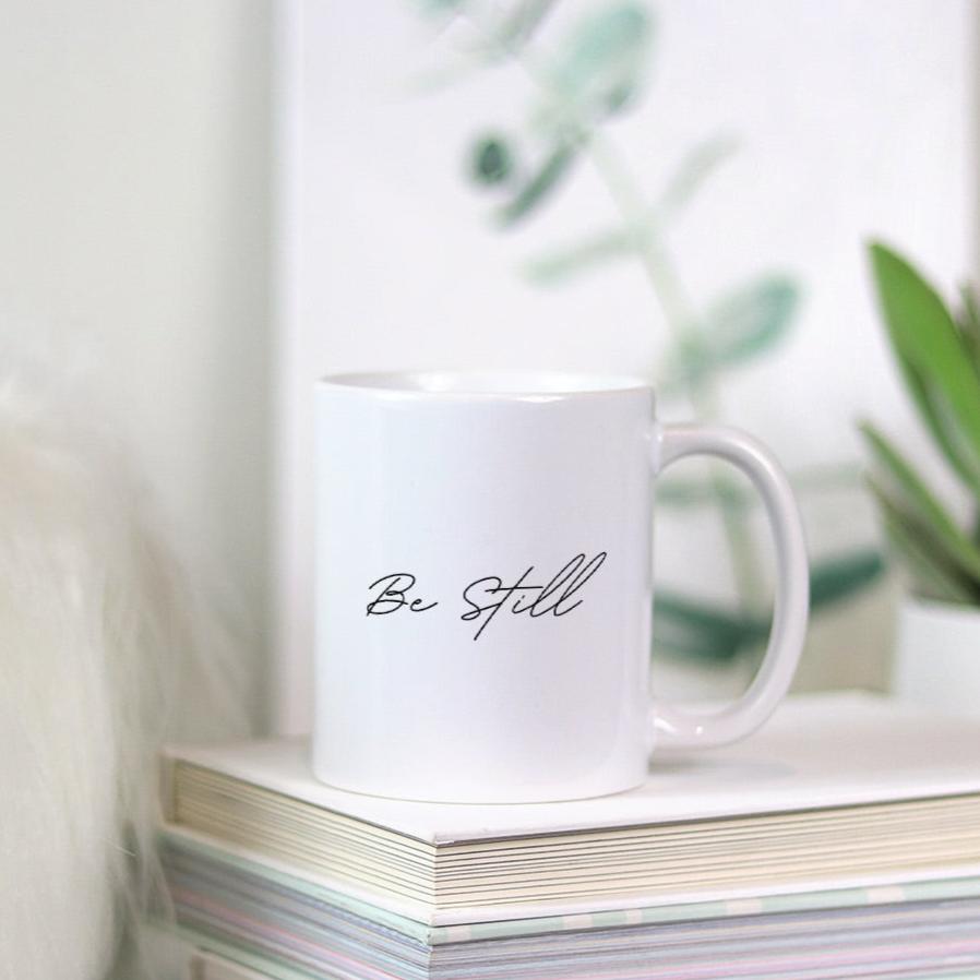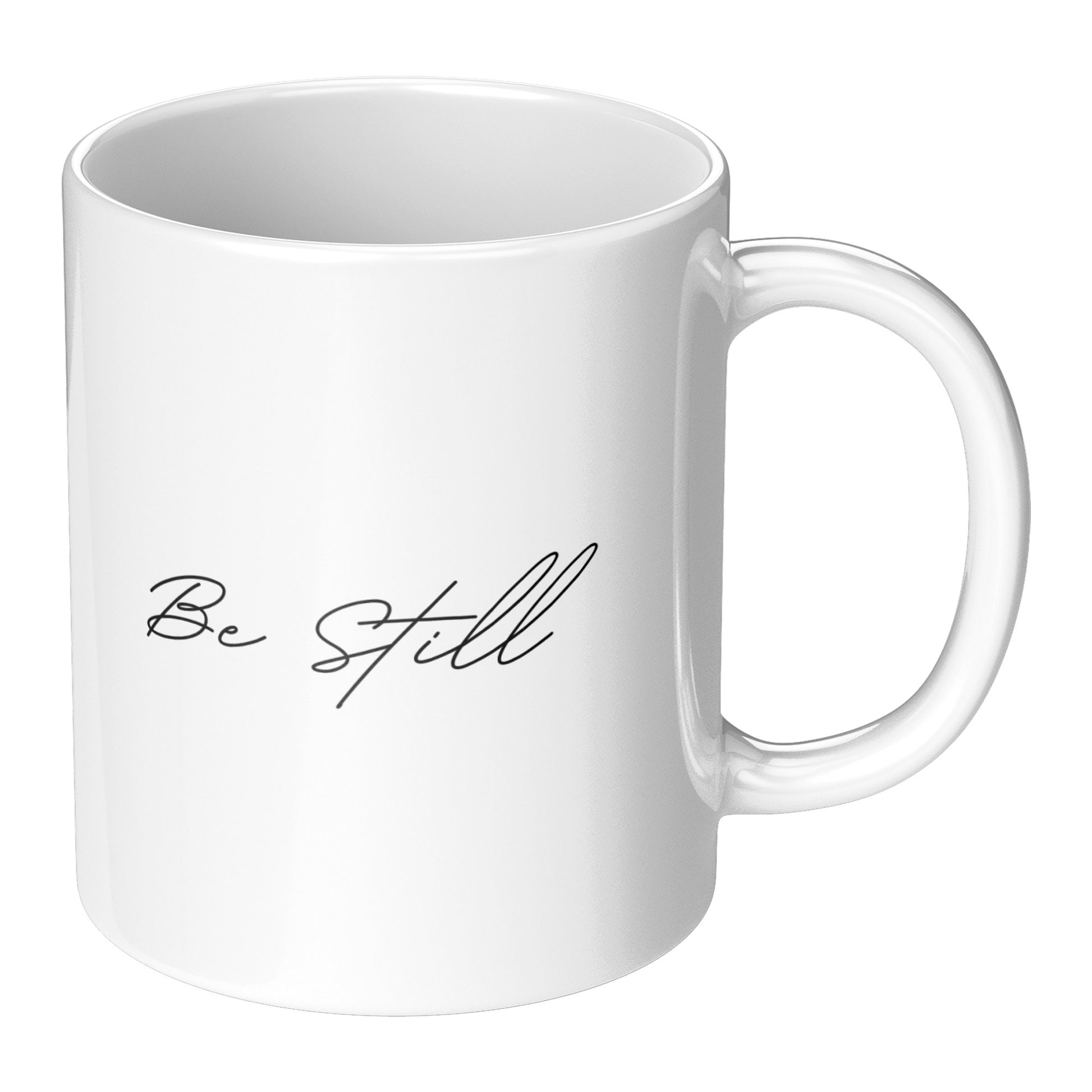 "Be Still." Our classic, clean white mug with scripture in black font has a premium hard coat that makes it as durable as it is beautiful.